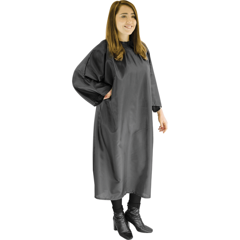 This professional hairdressing cape has no sleeves and fastens at the neck with poppers.